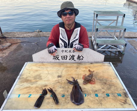 アオリイカ新子~0.4㎏ 3ハイ ガシラ24~25cm 2匹 丸ハゲ18cm 1匹 活けアジヤエン釣り |