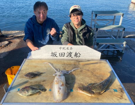 アオリイカ1.29㎏ 1ハイ 丸ハゲ20~26.5cm 2匹 マゴチ54cm 1匹 活けアジ飲ませ釣り |