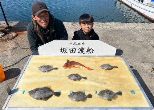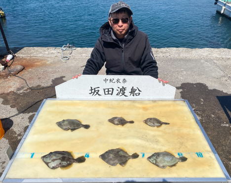 ヒラメ36~61cm 2匹 メゴチ45cm 1匹 丸ハゲ22~25cm 3匹 活けアジ飲ませ釣り |